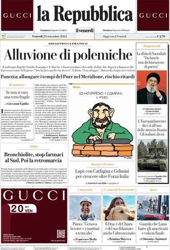 - "Alluvione di polemiche" titola La Repubblica raccontando di come il maltempo abbia flagellato Romagna e Marche: "Disastro climatico". "Se non si cura una terra fragile" è il commento a firma di Giovanni Egidio. Sul fronte Medioriente: "La sfida di Nasrallah: da Israele una dichiarazione di guerra'"