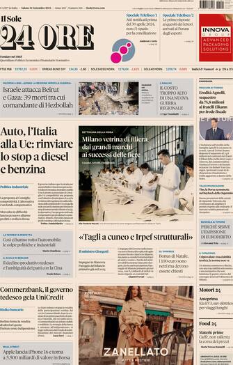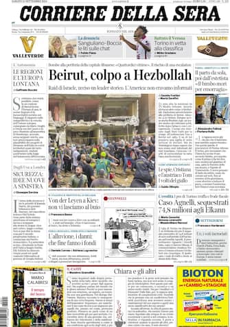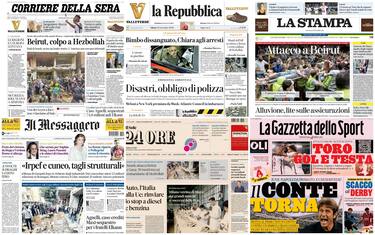 Le aperture dei giornali sono dedicate principalmente al raid israeliano a Beirut, con la morte del numero due (nonché capo militare) di Hezbollah e la discussione in seno alla maggioranza sull'obbligo di polizza per i disastri ambientali dopo l'alluvione in Emilia-Romagna. Focus anche sugli infanticidi di Parma, con l'arresto della 21enne e sull'eredità degli Agnelli, con il sequestro di 74,8 milioni da parte della Procura
