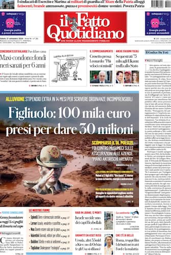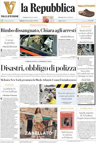 - Infanticidi di Parma, Chiara agli arresti. Emergenza ambientale, obbligo di polizza: dopo lo scontro sull'alluvione in Emilia-Romagna, stanziati 20 milioni. Ma il governo non ha più soldi per le calamità. Musumeci: "Lo Stato non pagherà più". E rilancia l'assicurazione clima per i privati, mentre slitta il vincolo per le imprese. Meloni a New York premiata da Musk: Atlantic Council in imbarazzo. Missili dell'Idf uccidono a Beirut i vertici militari di Hezbollah. Eredità Agnelli, sequestro di 74,8 milioni