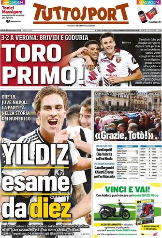- Juve-Napoli, la partita nella storia dei numeri 10: esame da numero diez per Yildiz. Motta: "Loro da scudetto, io mai contro Antonio Conte". Eredità Agnelli, sequestrati 74,8 milioni agli Elkann e a Ferrero. Toro, primo! 3-2 a Verona: brividi e goduria. L'omaggio di Palermo e dell'Italia a Schillaci: "Grazie Totò!"