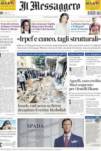 - Irpef e cuneo, tagli strutturali: mossa di Giorgetti dopo le richieste degli industriali. Dal concordato attesi 2,5 miliardi. Alluvione in Romagna, Meloni convoca il Cdm: stanziati 20 milioni. Israele, raid aereo su Beirut: tra i morti Aqil, capo militare di Hezbollah, ricercato dagli Usa. Caso eredità degli Agnelli, maxi sequestro per i fratelli Elkann: la procura blocca beni per 74,8 milioni