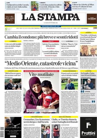 - "Medioriente, catastrofe vicina" è il titolo della Stampa che racconta l'escalation tra Hezbollah e Israele: "L'allarme dell'Onu: il Libano diventerà una nuova Gaza". "Vite mutilate" è il reportage a firma di Francesca Mannocchi dall'ospedale che cura i bambini palestinesi feriti. Taglio alto economico: "Cambia il condono: più breve e sconti ridotti"