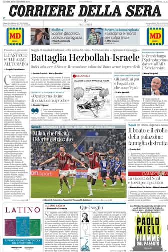 La crisi in Medioriente, con l'escalation degli scontri tra Israele e Hezbollah, il piano del governo su extraprofitti e tasse e il derby Inter-Milan finito 1-2 occupano le principali prime pagine di oggi