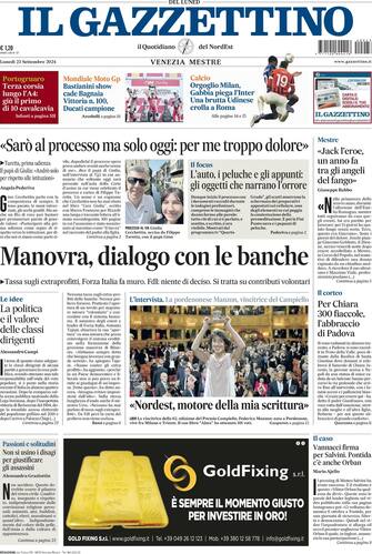 - Apertura dedicata alla cronaca, quella del Gazzettino, con racconto del processo a Filippo Turetta che si apre oggi a Venezia per il femminicidio di Giulia Cecchettin: "Sarò al processo ma solo oggi: per me troppo dolore" sono le parole del padre della vittima. Sul fronte economico: "Manovra, dialogo con le banche"