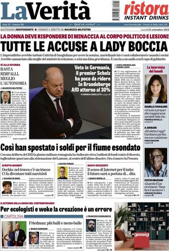 - "Tutte le accuse a Lady Boccia" è il titolo di apertura della Verità sul caso Sangiuliano: "La donna deve rispondere di minacce al corpo politico e lesioni". Taglio centrale dedicato al voto in Germania: "Il premier Scholz ha poco da ridere: in Brandebugo ADF attorno al 30%"