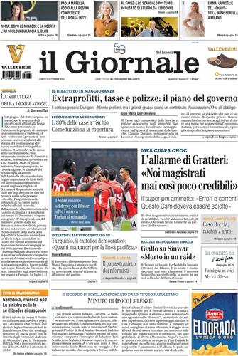 - Taglio alto economico quello del Giornale di questa mattina: "Extraprofitti, tasse e polizze: il piano del governo". Sul fronte magistratura, l'allarme di Gratteri: "Noi magistrati mai così poco credibili". "Il super pm ammette: errori e correnti. Questo Csm doveva essere sciolto". Fotonotizia dedicata al Derby