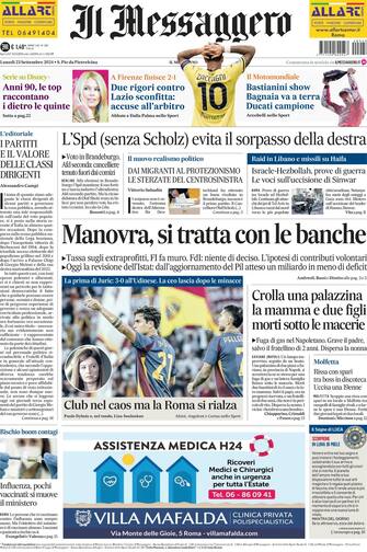 - "Manovra, si tratta con le banche" è il titolo di apertura del Messaggero. "Tassa sugli extraprofitti, FI fa muro. Fdi: niente di deciso". Spazio alla cronaca, con il dramma della palazzina crollata a Saviano (Napoli) costata la vita a due bambini e la loro madre, morti sotto le macerie