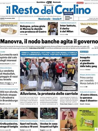 - "Manovra, il nodo banche agita il governo" è il titolo del Resto del Carlino sulle misure del governo a favore di famiglie e imprese. "Alluvione, la protesta delle carriole" racconta invece le conseguenze dell'ennesima alluvione che settimana scorsa ha piegato la Romagna: "Faenza, portano in piazza il fango"