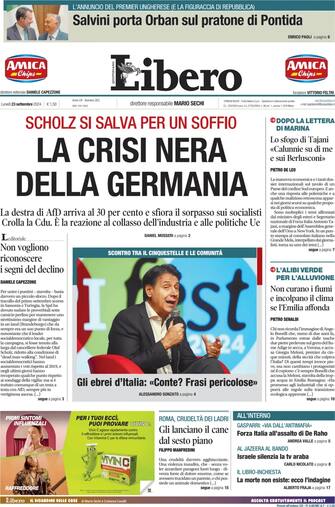 - "La crisi nera della Germania" è l'apertura di Libero secondo cui "Scholz si salva per un soffio". L'editoriale a firma di Daniele Capezzone: "Non vogliono riconoscere i segni del declino". Taglio centrale dedicato allo scontro tra Giuseppe Conte e le comunità di ebrei in Italia per "frasi pericolose" del presidente del Movimento 5 stelle