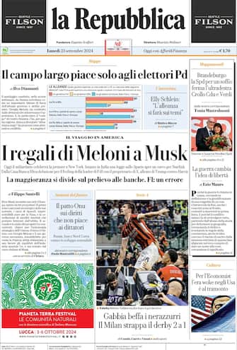 - "Il campo largo piace solo agli elettori Pd" titola questa mattina La Repubblica con un pezzo a mappe che disegna le alleanze politiche a firma di Ilvo Diamanti. "I regali di Meloni a Musk" racconta invece che "oggi il miliardario celebrerà la premier a New York". Fotonotizia dedicata alla serie A: "Gabbia beffa i nerazzurri. Il Milan strappa il Derby 2-1"