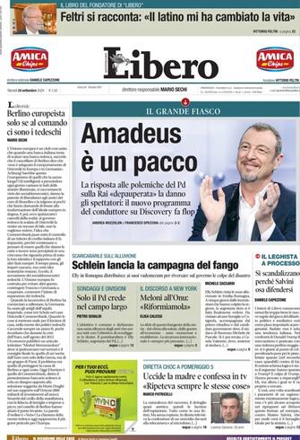 - "Amedeus è un pacco" è il titolo di apertura, incentrato sulla "risposta alle polemiche del Pd sulla Rai 'depauperata': il nuovo programma del conduttore su Discovery fa flop". Questione alluvione: "Schlein lancia la campagna del fango". Meloni all'Onu: "Riformiamola". Nel Modenese un uomo confessa in tv di aver ucciso la propria madre