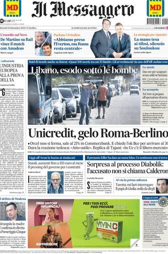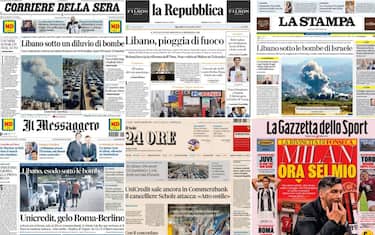 E' l'attacco di Israele ad Hezbollah a dominare le prime pagine dei quotidiani odierni con il Libano colpito da intensi bombardamenti e migliaia di sfollati costretti alla fuga. Tra gli altri temi anche il gelo tra Roma e Berlino per la questione Unicredit-Commerzbank e la confessione in diretta tv di un uomo che ha ammesso di aver ucciso la propria madre nel Modenese