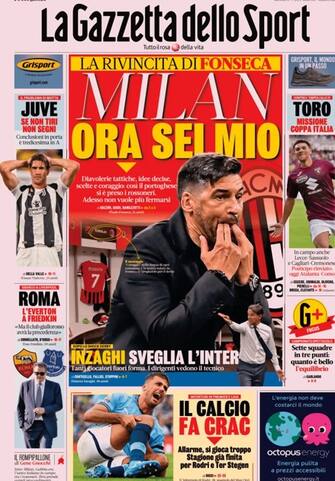 - Dopo il vittorioso derby di Milano sorride l'allenatore rossonero Fonseca: "Milan, ora sei mio" mentre quello nerazzurro "sveglia l'Inter". Analisi sulla Juventus: "Se non tiri non segni". Il Torino affronta la Coppa Italia, intanto è allarme infortuni: per Ter Stegen e Rodri stagione già finita.