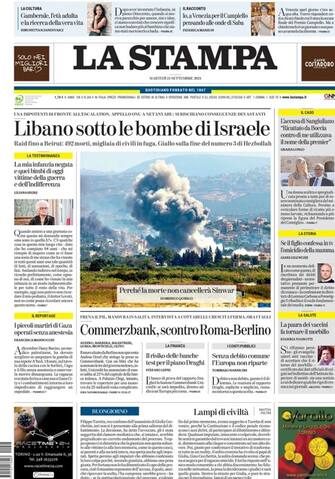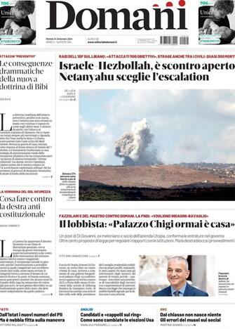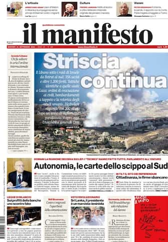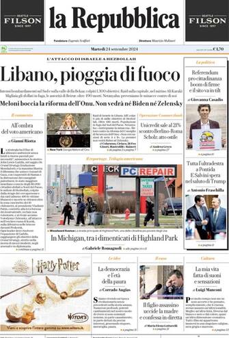 - L'attacco di Israele ad Hezbollah in primo piano: "Libano, pioggia di fuoco". Intensi bombardamenti nel Sud e sulla valle della Bekaa: "colpiti 1300 obiettivi", migliaia gli sfollati in fuga. Intanto "Meloni boccia la riforma dell'Onu". Spazio ancora per un reportage dal Michigan "tra i dimenticati di Highland Park" e per la confessione in diretta tv di un uomo che ha ucciso la propria madre nel Modenese