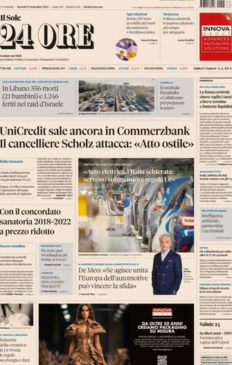- Il risiko bancario in apertura: "Unicredit sale ancora in Commerzbank" mentre il cancelliere Scholz attacca: "Atto ostile". Spazio poi al tema del concordato con la "sanatoria 2018-2022 a prezzo ridotto". In taglio alto la guerra in Medio Oriente con l'ultima serie di attacchi israeliani in Libano che hanno portato morti e feriti
