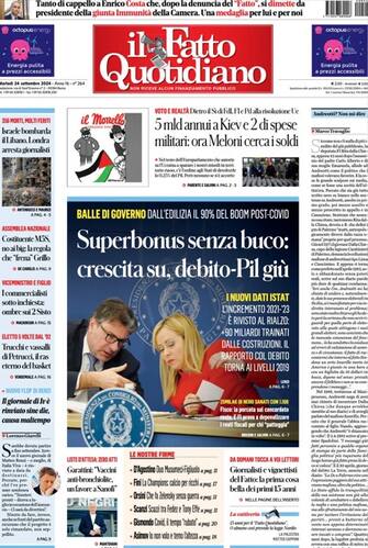 - Apertura sul fronte economico e sui nuovi dati Istat. "Superbonus, senza buco: crescita su, debito-Pil giù". In taglio alto Meloni "cerca soldi" per le spese militari, mentre Israele bombarda il Libano e "Londra arresta i giornalisti"