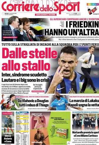 - I Friedkin, proprietari della Roma, sbarcano anche in Premier League e comprano l'Everton. Intanto Inter "dalle stelle allo stallo": strigliata di Inzaghi ai suoi dopo il derby. La Juventus è "senza gol, Motta cerca soluzioni" mentre Lukaku "sogna la vetta" del campionato con il Napoli
