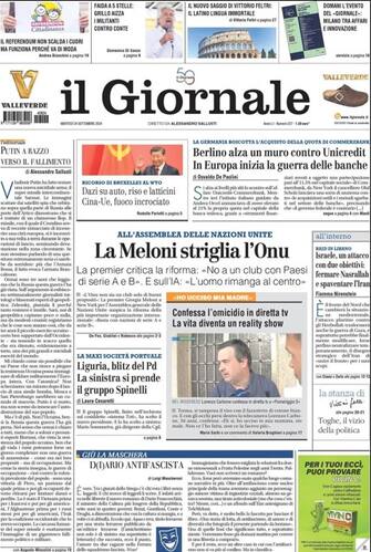 - All'assemblrea della Nazioni Unite "Meloni striglia l'Onu" e ne critica la riforma: "No a club con Paesi di serie A e B". In Germania "Berlino alza un muro contro Unicredit" mentre è "fuoco incrociato" tra Cine e Ue sui dazi per auto, riso e latticini. Di spalla i nuovi attacchi di Israele contro Hezbollah in Libano, fotonotizia sul figlio che confessa l'omicidio della madre in diretta tv