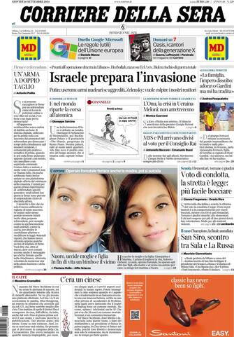 - Medioriente al centro della prima pagina del quotidiano: Israele prepara l’invasione e si dice pronto all’operazione di terra in Libano. Caldo anche il fronte della guerra in Ucraina con Putin che torna a minacciare l’utilizzo della bomba atomica se aggredito. In fotonotizia il dramma di Nuoro dell’operaio che ha ucciso la moglie e una figlia, e poi si suicida. Novità nella scuola con il ritorno del voto in condotta: la stretta sulla disciplina scolastica renderà più facile bocciare, sarà sufficiente il 5 in comportamento