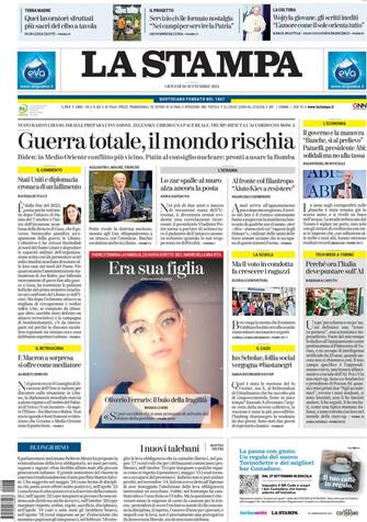 - La guerra in Medioriente e della in Ucraina preoccupano gli Usa tra rischio di escalation in Libano e la minaccia di Putin sul nucleare. Il commento di Nathalie Tocci: “Stati Uniti e diplomazia, cronaca di un fallimento”. La strage di Nuoro: l’uomo ha sterminato la famiglia prima di togliersi la vita. La figlia gli aveva dedicato la tesi di laurea: “Papà, l’amore della mia vita”. Posto in prima pagina anche per la Tech Week di Torino: “Perché ora l’Italia deve puntare sull’AI”