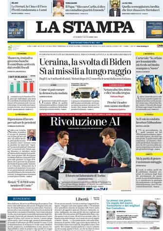 - E' il conflitto in Ucraina a dominare l'apertura con la "svolta di Biden" per Kiev: "Sì ai missili a lungo raggio". Intanto in Libano proseguono gli attacchi di Israele. Fotonotizia incentrata sul tema della "rivoluzione dell'intelligenza artificiale" al centro di un dialogo tra Sam Altman e John Elkann. Di spalla intervista ad Andrea Carnevale e focus sul voto in condotta a scuola