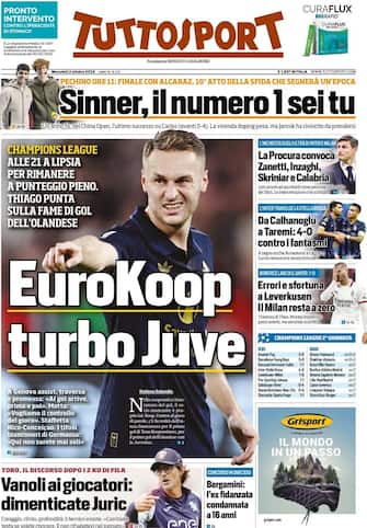 - Su Tuttosport vigilia di Champions per la Juventus, attesa in Germania dal Lipsia per rimanere a punteggio pieno. Thiago Motta punta su Koopmeiners. Taglio alto per la finale extra lusso dell'Atp di Pechino tra Jannik Sinner e Carlos Alcaraz