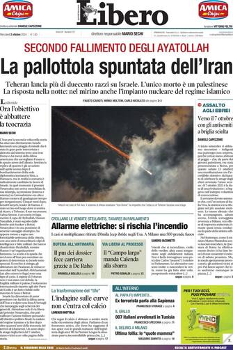 - Libero parla di 'fallimento degli Ayatollah', titolando in apertura 'La pallottola spuntata dell'Iran'. A centro pagina, l'allarme per le auto elettriche: "Si rischia l'incendio", scrive il quotidiano diretto da Mario Sechi