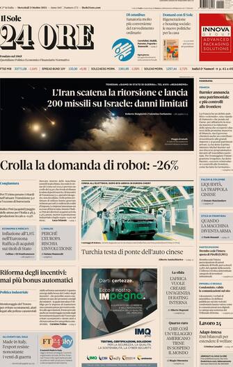 - Crolla la domanda dei robot sulla prima del Sole 24 Ore, che non può però fare a meno di richiamare in prima pagina i tragici fatti che nelle ultime ore hanno segnato l'escalation in Medioriente