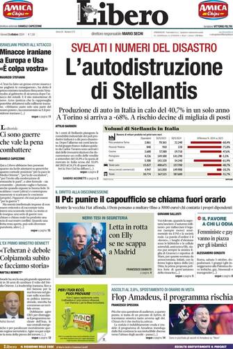 - "L'autodistruzione di Stellantis" è il titolo di apertura di Libero, che racconta come la produzione di auto in Italia sia calata del 40%. "Svelati i numeri del disastro". Taglio centrale dedicato alla politica interna, con le tensioni in casa Pd: "Letta in rotta con Elly se ne scappa a Madrid"