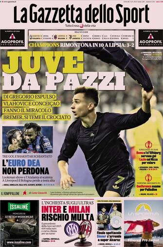 - "Juve da pazzi" è il titolo a tutta pagina della Gazzetta che racconta la vittoria dei bianconeri contro il Lipsia (3-2). Spazio anche all'inchiesta sugli ultras che ha occupato pagine dei giornali nei giorni scorsi: "Inter e Milan rischio multa"