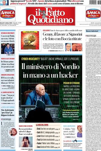 - Apertura diversa per il Fatto Quotidiano, che parla di "cyber-insicurity": "Il ministero di Nordio in mano a un hacker. "Bucati anche Viminale, Guardia di Finanza e 5 Procure". "Razze inferiori" è il titolo dell'editoriale del direttore Marco Travaglio
