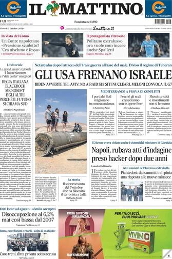 - "Gli Usa frenano Israele" è l'apertura del Mattino di Napoli. "Biden avverte Tel Aviv: no a raid sui siti nucleari. Meloni convoca il G7". Una storia dal Medioriente a firma di Raffaella Trolli: "Il sopravvissuto del 7 ottobre che ha bloccato il terrorista a Jaffa"