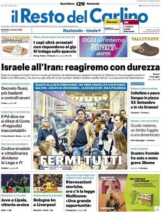 - "Israele all'Iran: reagiremo con durezza" titola il Resto del Carlino dopo la pioggia di missili a Tel Aviv. "Fermi tutti": taglio centrale dedicato allo stop dei trasporti, che ha ieri ha portato alla cancellazione di un centinaio di treni