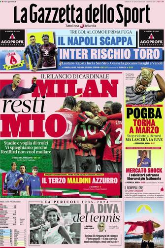 - Il rilancio di Cardinale: Milan resti mio. Stadio e voglia di trofei, vi spieghiamo perché RedBird non vuol mollare. Pogba torna a marzo, stop ridotto a 18 mesi (ma lascerà la Juve). Il Napoli scappa (tre gol al Como e prima fuga), Inter rischio Toro. Lautaro-Zapata, luci a Sans Siro: così se la giocano Inzaghi e Vanoli