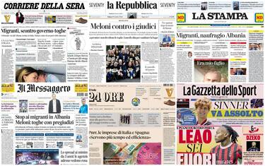 Le aperture dei giornali sono dedicate alla bocciatura dei giudici del tribunale civile di Roma al "modello Albania" per i migranti: i 12 profughi devono essere portati in Italia. Ira della premier Meloni ("Non decidono le toghe"), il governo annuncia ricorso. Lunedì la questione in Cdm. In primo piano anche il processo Open Arms, coi ministri leghisti in piazza per difendere Salvini, e lo sciopero unitario dei sindacati contro Stellantis