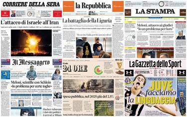 A parte il Corriere della Sera, l'unico ad avere la notizia della notte dell'attacco di Israele all'Iran, le aperture dei giornali sono dedicate alle imminenti elezioni in Liguria e alle tensioni interne a Fratelli d'Italia dopo il caso Spano. Spazio poi al nuovo dossieraggio su commissione a danno di politici, con quattro arresti a Milano, e alle parole di Turetta, reo confesso del femminicidio di Giulia Cecchettin, nel processo a suo carico
