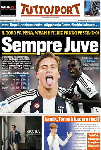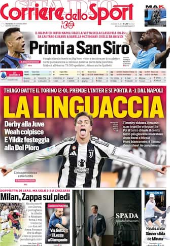 - La linguaccia: derby alla Juve, Weah colpisce e Yildiz festeggia alla Del Piero. Thiago batte il Torino 2-0, prende l'Inter e si porta a -1 dal Napoli. Stasera nerazzurri contro Conte: Inzaghi rilancia Acerbi su Big Rom: "Non è decisiva per lo Scudetto". I partenopei puntano su Gilmour, Lobotka dalla panchina. Sold out al Meazza: 73mila spettatori, atteso anche Spalletti. Milan, Zappa sui piedi: 3-3 a Cagliari