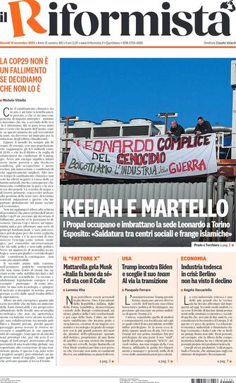 - "Kefiah e martello" è l'apertura di oggi de Il Riformista. "I propal occupano e imbrattano la sede Leonardo a Torino". Spazio poi alla Cop29 a Beku: "La Cop29 non è un fallimento se decidiamo che non o è" di Michele Vitiello. La replica di Mattarella a Musk: "L'Italia fa bene da sé". Poi, gli Usa: "Trump incontra Biden e sceglie il suo team: al via la transizione"