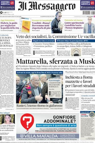 - In apertura ancora la risposta del presidente della Repubblica al proprietario di X: "Mattarella, sferzata a Musk". Al centro, fotonotizia di sport: "Ranieri, l'eterno ritorno in giallorosso". In taglio alto, l'Europa: "Veto dei socialisti, la Commissione Ue vacilla". Spazio alla cronaca con l'inchiesta a Roma: "Mazzette e favori per i lavori stradali". Poi, l'editoriale di Ferdinando Adornato: "L'Europa rovesci la sfida di Donald"