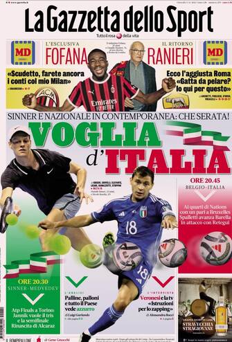 - "Voglia d'Italia" è il titolo d'apertura di oggi della Gazzetta dello Sport dedicato ai due grandi eventi di giornata: alle 20.30 Sinner-Medvedev e alle 20.45 Belgio-Italia. Sul fronte tennis, "Atp Finals a Torino: Jannik vuole il tris e la semifinale". Sul fronte calcio, "Ai quarti di Nations con un pari a Bruxelles, Spalletti avanza Barella in attacco con Retegui"