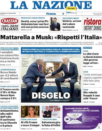 - In apertura, ancora la risposta del presidente della Repubblica al patron di Tesla: "Mattarella: Musk rispetti l'Italia". E la reazione della premier Meloni: "Ascoltiamo sempre il Capo dello Stato". Al centro, fotonotizia sull'incontro tra Biden e Trump alla Casa Bianca: "Grazie per la transizione tranquilla". Spazio alla Commissione Ue con "I socialisti: no a Fitto, la fiducia è rotta". Poi, la morte del sociologo Franco Ferrarotti