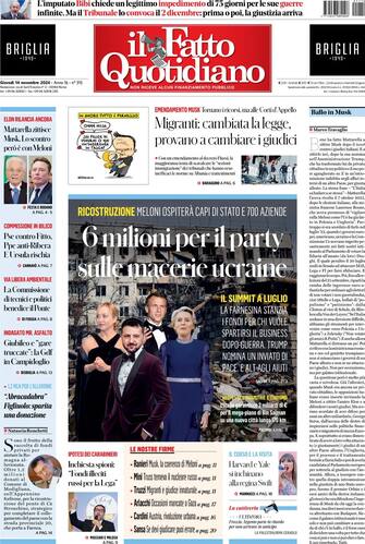 - In apertura ancora le parole di Mattarella a Musk: "Rispetti l'Italia", "Imbarazzo di Meloni e dei sovranisti". E ancora su Elon Musk: "L'arroganza dell'amico e i silenzi della premier". Spazio poi alla cronaca con "La clinica di Gemmato e quei soldi a FdI". Poi, l'intervento della premier Meloni alla Cop29 a Baku: "Favole sul clima: così la premier cancella la realtà"