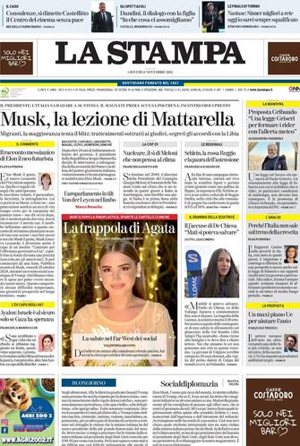 - "Musk, lezione di Mattarella" è l'apertura di oggi de La Stampa. Al centro, fotonotizia di cronaca sulla ragazza di 22 anni morta a seguito di una rinoplastica: "La trappola di Agata". Spazio poi alla Cop29 a Baku: "Nucleare, il sì di Meloni che non pensa al clima". E ancora, "Europarlamento in tilt, Von der Leyen nel limbo" a firma di Marco Bresolin