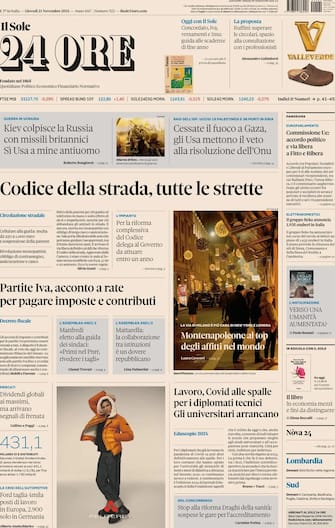 - Le strette del nuovo Codice della strada sulla prima pagina del Sole 24 Ore, dopo il via libero definitivo arrivato nella giornata di ieri. Taglio alto per i conflitti in corso, col sì alle mine antiuomo per l'Ucraina e il veto Usa alla risoluzione dell'Onu per il cessate il fuoco a Gaza