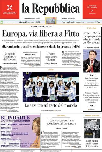 - Il via libera a Fitto nella composizione della squadra di Ursula von der Leyen apre, invece, l'edizione odierna di Repubblica. Ok pure alla nomina della candidata spagnola Ribera, a chiudere lo scontro sulle vicepresidenze esecutive. Anche qui in evidenza il trionfo di Paolini, Errani e Bronzetti. Di spalla, intervista al leader M5s Giuseppe Conte, che dice: "Con i progressisti o lascio"