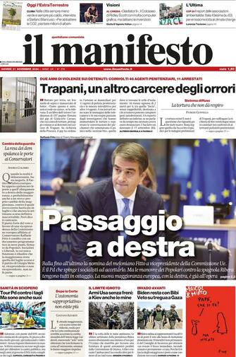 - 'Passaggio a destra' è il titolo scelto dal Manifesto per la vicepresidenza della Commissione Ue. Si parla anche delle violenze sui detenuti nel carcere di Trapani: coinvolti 46 agenti penitenziari, 11 arrestati