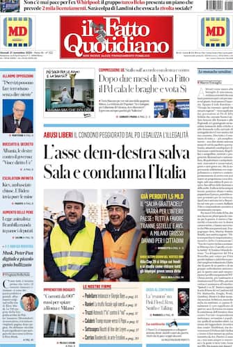 - 'L'asse dem-destra salva Sala e condanna l'Italia' scrive Il Fatto Quotidiano, parlando del cosiddetto 'Salva-grattacieli'. Fitto e il caso degli imprenditori indagati per presunto spionaggio gli altri temi in evidenza in prima