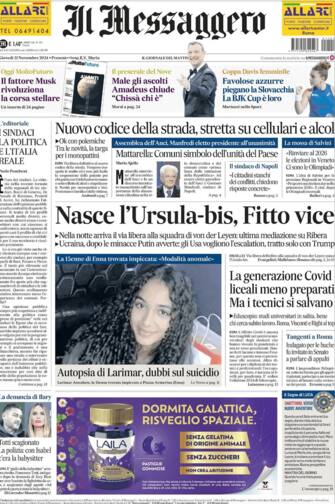 - L'Ursula-bis, con la nomina di Fitto e Ribera al termine di una lunga mediazione, è il titolo principale anche del Messaggero, che pone in evidenza anche la riforma del Codice della strada e la cronaca, con i dubbi sul suicidio di Larimar Annaloro, la 15enne trovata impiccata a Piazza Armerina