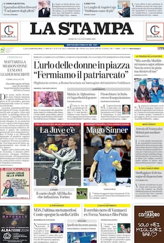 - Anche La Stampa parte da "L'urlo delle donne in piazza" contro il patriarcato. Poi lo sport, con il trionfo di Sinner e con il pareggio dei bianconeri contro il Milan