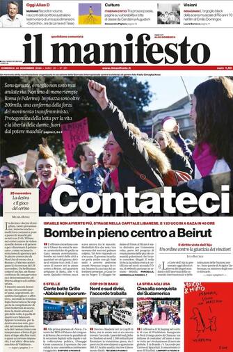 - "Contateci", titola Il Manifesto parlando della manifestazione contro il patriarcato. Poi "bombe in pieno centro a Beirut", "Conte batte Grillo", la Cop29 e la "Cina alla conquista del Sudamerica"